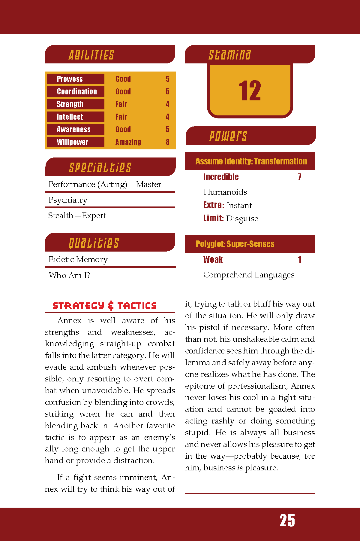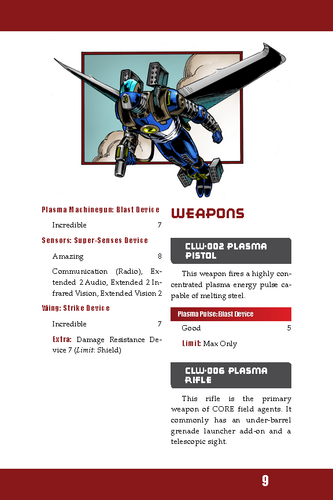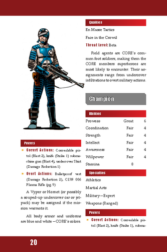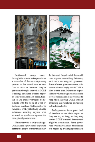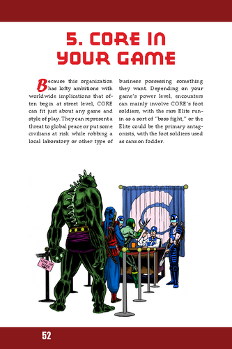 A series of “caper” ideas are included to help Gamemasters incorporate CORE into their game. There’s also a “Your World No Longer” section that provides a framework for running a game wherein CORE succeeds at conquering the world.